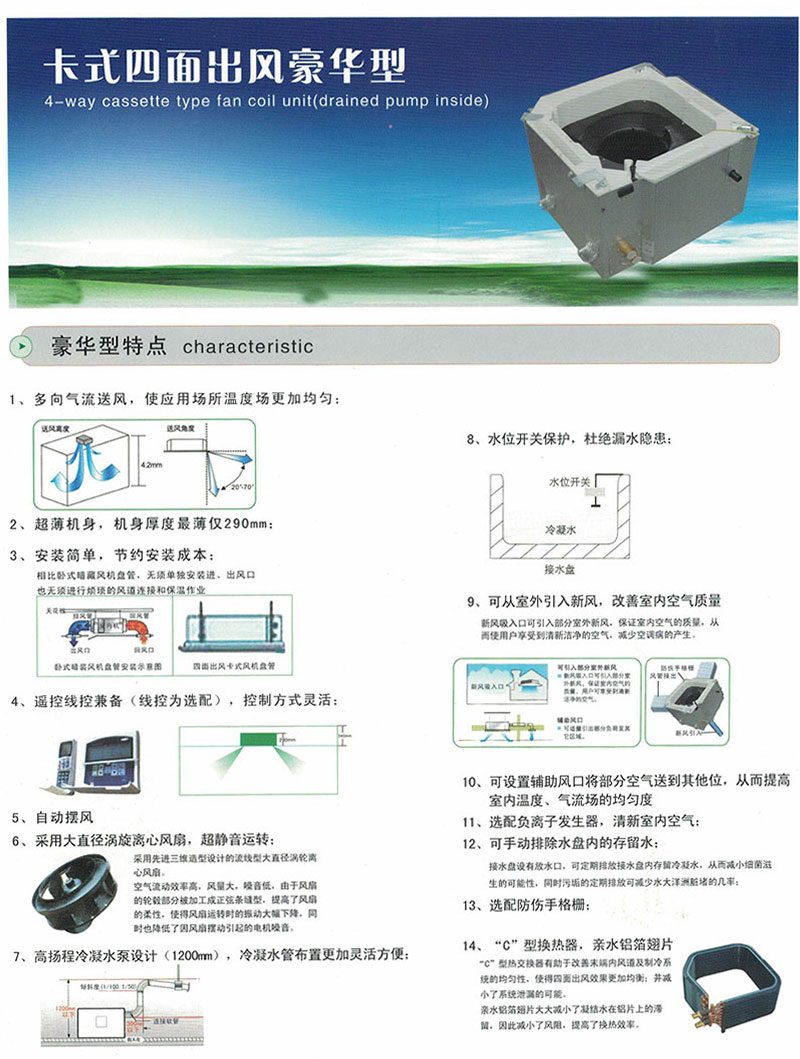 卡式風機盤管適用于房間面積較大,用其它機組效果欠佳或難于使用的場合。卡式風機盤管隱藏于天花板內,送回風口與吊頂的天花板融為一體,美觀協調、豪華、氣派。我公司生產的風機盤管采用標準型,結構簡潔緊湊,占用空間小,便于裝拆和維修。機體運轉平穩、噪音低、水阻小、重量輕、效率高、壽命長,是一種理想的空調設備。