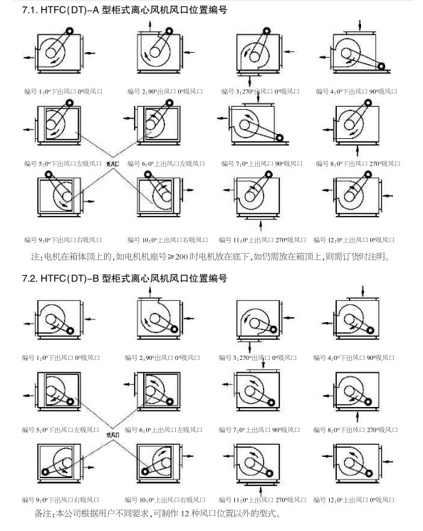4.HTFC(DT)系列低噪聲消防通風(兩用)柜式離心風機分為A型和B型兩種類型,A型電機裝在箱體外,用于消防排煙;B型電機裝在箱體內,用于通風換氣。